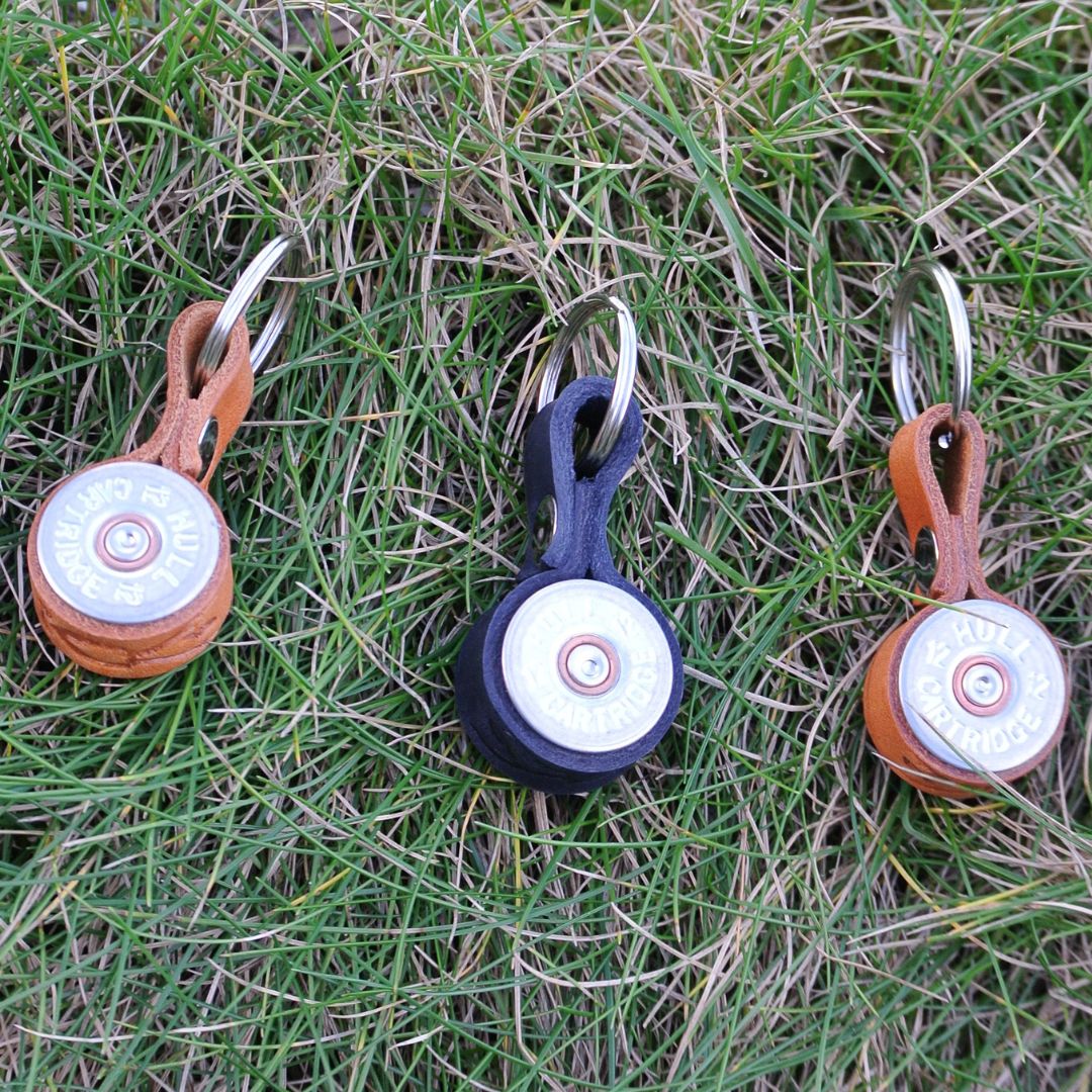 This uniquely designed key ring is handmade from two 12 bore shotgun cartridges wrapped in leather and riveted together creating a eye catching key ring.